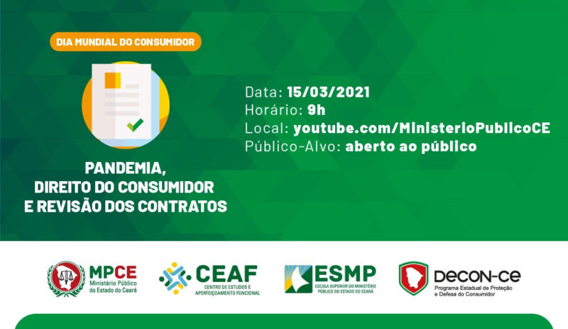O Programa Estadual de Proteção e Defesa do Consumidor (DECON), do Ministério Público do Estado do Ceará (MPCE), em parceria com o Centro de Estudos e Aperfeiçoamento Funcional (CEAF) e com a Escola Superior do Ministério Público (ESMP), realizará, no dia 15 de março de 2021, uma programação voltada ao Dia Mundial do Consumidor. O evento, que será transmitido pelo canal do MPCE no YouTube, é aberto ao público e objetiva esclarecer dúvidas dos consumidores sobre os temas abordados.