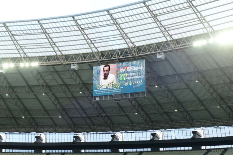 Uma parceria entre a Secretaria da Segurança Pública e Defesa Social (SSPDS), por meio da Polícia Civil do Estado Ceará (PC-CE), com a Secretaria do Esporte (Sesporte), resultou em uma ação na partida entre Fortaleza e Corinthians, jogo realizado na noite dessa quinta-feira (14), na Arena Castelão. A iniciativa contou com a exibição de vídeos de pessoas desaparecidas no Ceará para auxiliar os trabalhos policiais da 12ª Delegacia do Departamento de Homicídios e Proteção à Pessoa (DHPP), unidade especializada da Polícia Civil.