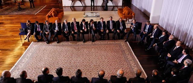 Em busca de apoio em meio à crise política, o presidente Michel Temer reuniu ontem 20 governadores e vice-governadores em um jantar no Palácio da Alvorada. O encontro foi intermediado pelo presidente do BNDES, Paulo Rabello de Castro, que enviou ofício aos estados com a promessa de tratar da repactuação das dívidas dos governos regionais com a instituição. Essa renegociação havia sido aprovada pelo Congresso há seis meses, mas ainda não saiu do papel por falta de regulamentação. No total, os valores envolvidos somam R$ 50 bilhões.