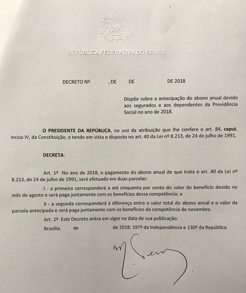 No passado, Temer editou decreto semelhante, antecipando a primeira parcela do 13º.