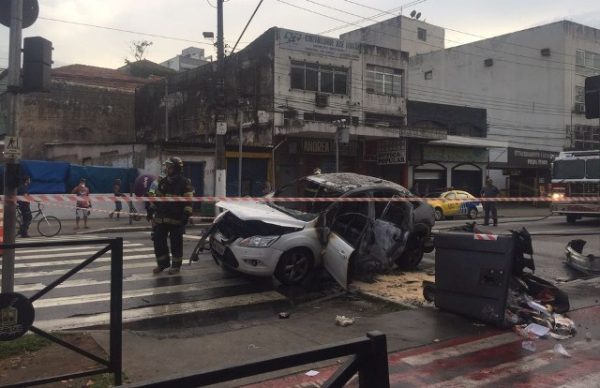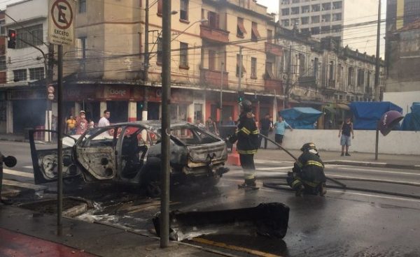 O caso ocorreu na manhã desta quinta-feira (18/01), em Santos, litoral paulista. Grupo pulou no carro, arrancou porta e, em seguida, colocou fogo no veículo.