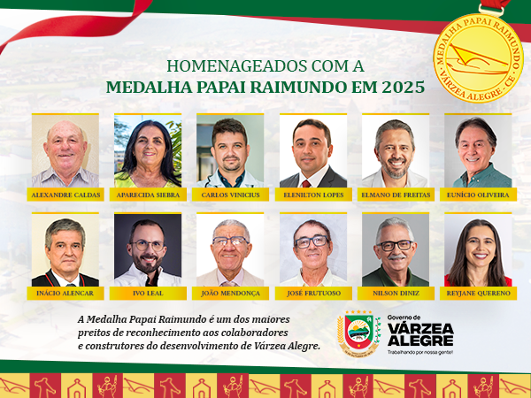 A Prefeitura de Várzea Alegre anunciou, nesta quinta-feira dia 14 de agosto de 2025, os nomes dos 12 homenageados que receberão a Medalha Papai Raimundo 2025, uma das mais importantes condecorações do município. A solenidade está marcada para sábado, 23 de agosto, às 15h, no auditório da Escola Dr. Pedro Sátiro.
