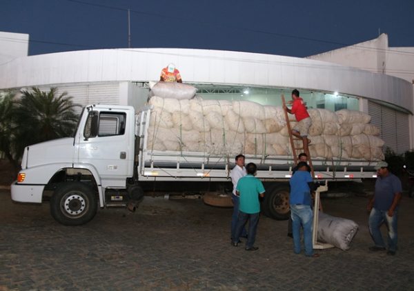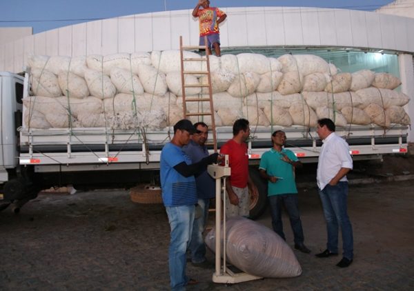 O prefeito Zé Helder (MDB) e o secretário de Desenvolvimento Agrário, Cícero Izidório, acompanharam o carregamento dos caminhões de algodão, no pátio do prédio onde funciona a secretaria.