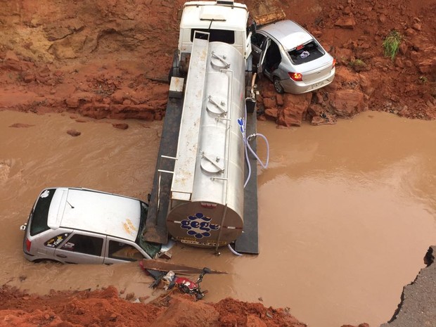 Segundo informações do Corpo de Bombeiros, um caminhão que transportava leite, dois carros e uma moto caíram na cratera. Seis pessoas se envolveram no acidente.