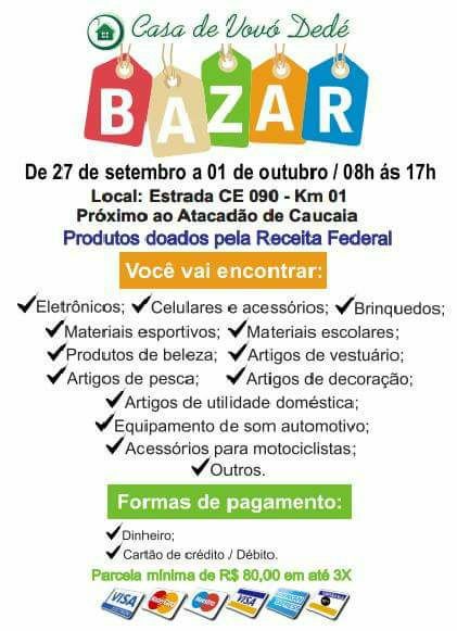 O Bazar Beneficente da Casa de Vovó Dedé, vai funciona na Estrada CE 090, Km 1, perto do Atacadão e da Prefeitura de Caucaia.
