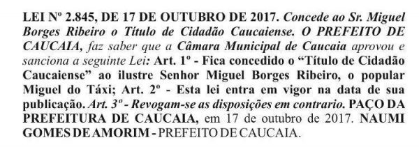Na sessão do último dia (17/10) promulgada a proposição requerida pelo vereador Weibe Tapeba (PT) que concede o título de cidadão caucaense ao senhor Miguel Borges Ribeiro, conhecido carinhosamente como Miguel do taxi.