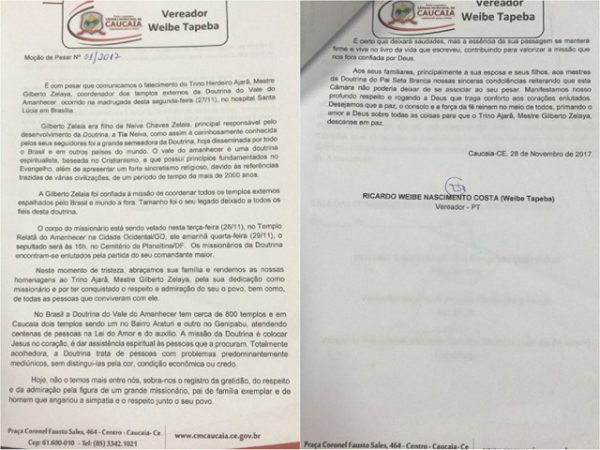 Na Sessão Legislativa da última quinta-feira (28/11) o vereador e Índio, Weibe Tapeba (PT), apresentou uma moção de pesar, subscrito por todos os vereadores presentes na sessão, aos familiares do Trino Herdeiro Ajarã, Mestre Gilberto Zelaya, coordenador dos templos externos da Doutrina do Vale do Amanhecer, em decorrência do seu falecimento, ocorrido na madrugada de segunda-feira (27/11), no hospital Santa Lúcia em Brasília.