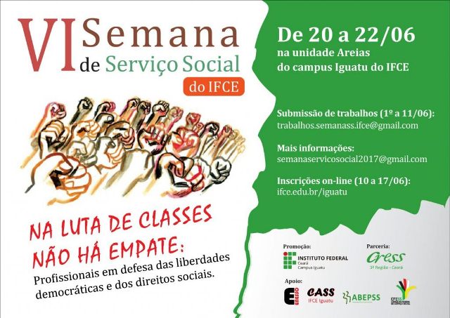 O campus realizará entre os dias 20 e 22 junho a 6ª Semana de Serviço Social terá como título: “Na luta de classes não há empate: profissionais em defesa das liberdades democráticas e dos direitos sociais”. O evento será realizado na unidade Areias do campus Iguatu do IFCE, com programação nos três turnos.